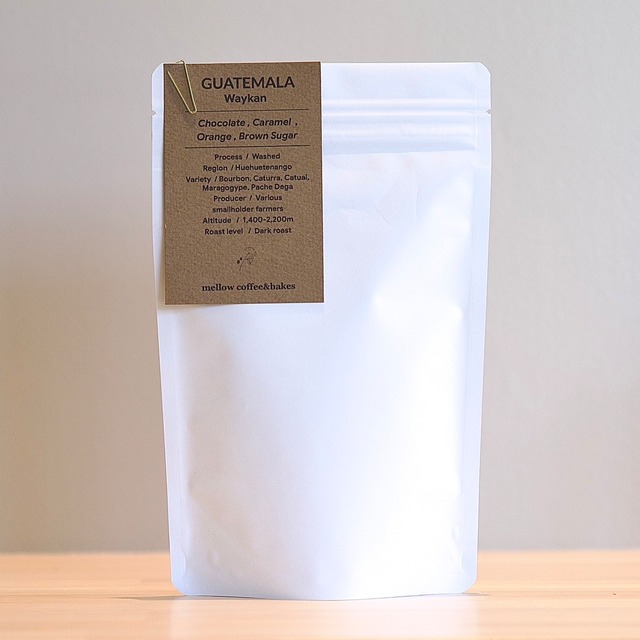 【STORY】 グァテマラ・ウェイカンは、同国北西部のウェウェテナンゴ地域を中心に栽培される、標高1600m以上のマイクロロットです。 火山灰由来のミネラル豊富な土壌と、日較差の大きな気候条件が、クリーンで繊細な果実味と、明るく上品な酸味を生み出します。 “Waykan”はマヤ先住民の言葉で「星の光」を意味し、その名の通り、明瞭な味わいと華やかな香りが特長です。 精製はウォッシュドプロセスで、発酵・乾燥管理がしっかりされたロットは、グァテマラの中でも特に安定した甘さとクリーンカップを備えています。 【FRAVOR PROFILE】 甘さの質感にこだわりながらも、深煎りに仕上げました。 深煎りにする際は、焦がしすぎず、甘味が残るギリギリの地点で焙煎を止めることで、豊かな風味のバランスを保っています。 しっかりとした焙煎感はありながら、焦げ感やエグみを抑え、カカオやビターチョコを思わせるコクと、黒糖やドライプラムのような甘みが共存する味わいに仕上げました。 【INFORMATION】 生産国 / グァテマラ 生産者 / 様々な小規模農家 地域 /ウェウェテナンゴ 品種 / Bourbon、Caturra、Catimor、Maragogype、Pache 精製方法 / 水洗式 標高 / 1400-2200masl